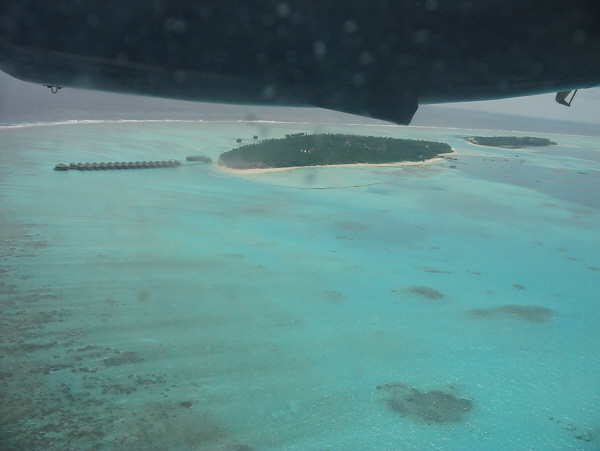 L'île de Meerufenfushi, vue d'hydravion, avec à droite l'île de Dhiffushi. |