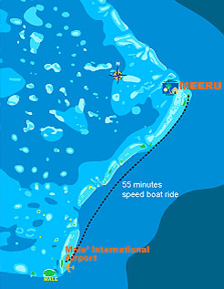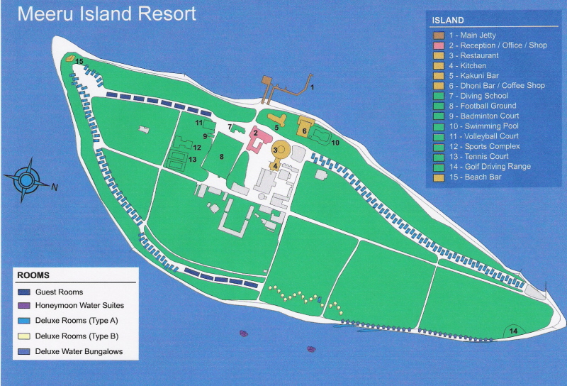 MEERUFENFUSHI Île paradisiaque de l'atoll de Malé Nord, située à environ 1 heure de l'aéroport de Malé (capitale). Protégée par une barrière de corail, l'île est longue de 1,5 km et large de 600 m. L'hôtel compte 227 bungalow dont 58 standards, 118 landvillas, 20 jacuzzi villas, 29 water villas et 2 honey moon. De plus un nouvel hôtel sur pilotis vient d'ouvrir contenant des chambres avec un plancher en verre pour voir directement les fonds marins de la chambre. L'hôtel compte environ 450 salariés tous dévoués pour le bon déroulement de votre séjour. Ils proviennent tous de différents horizons (Maldives, Sri Lanka, Suisse, Île Maurice...). Plan de Meeru |